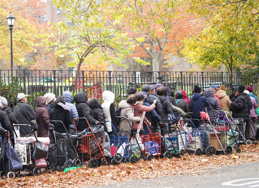 美國紐約一處食物發(fā)放點人們在領取食物 美政府“停擺”三周聯邦雇員排隊領食品救濟